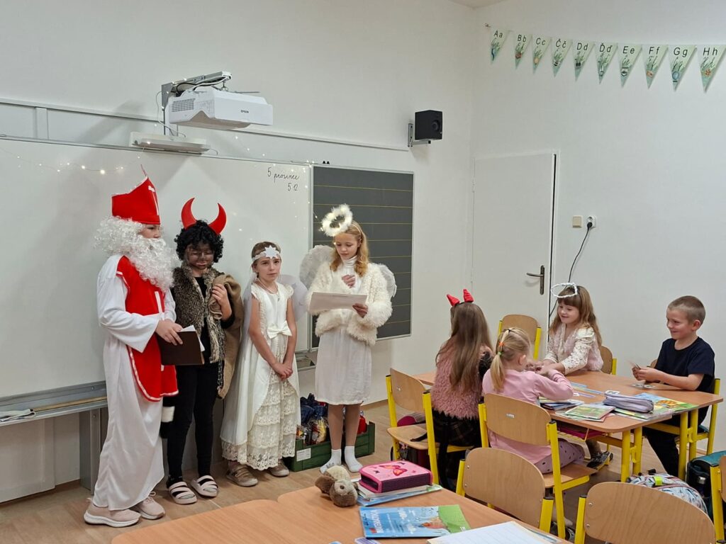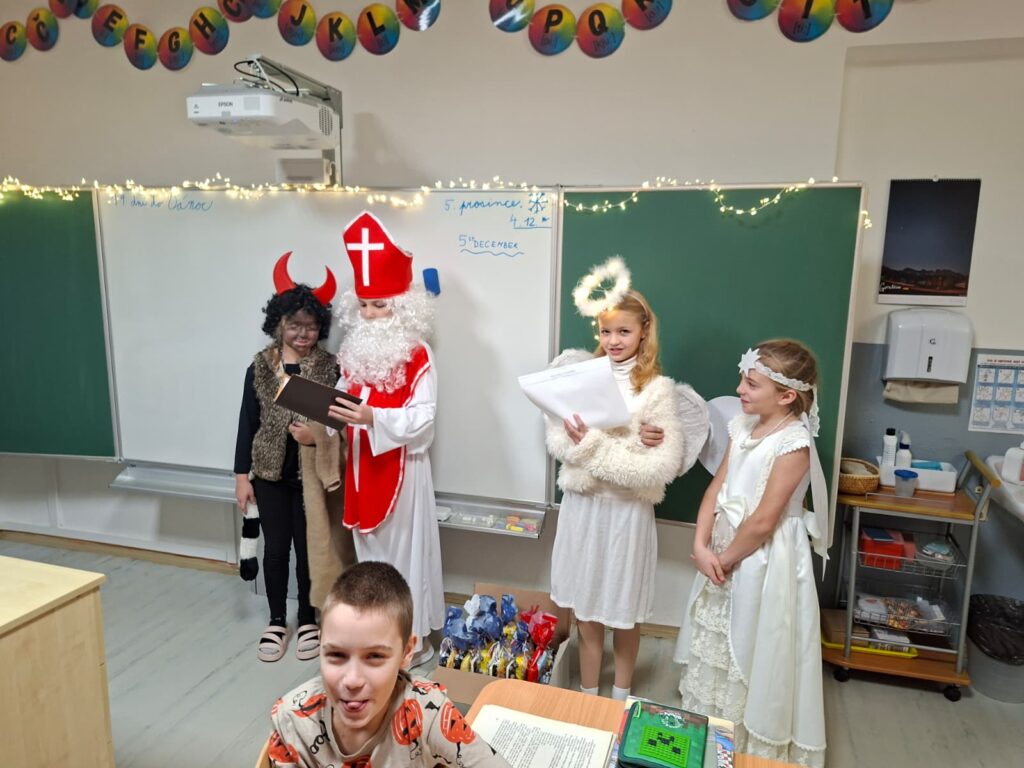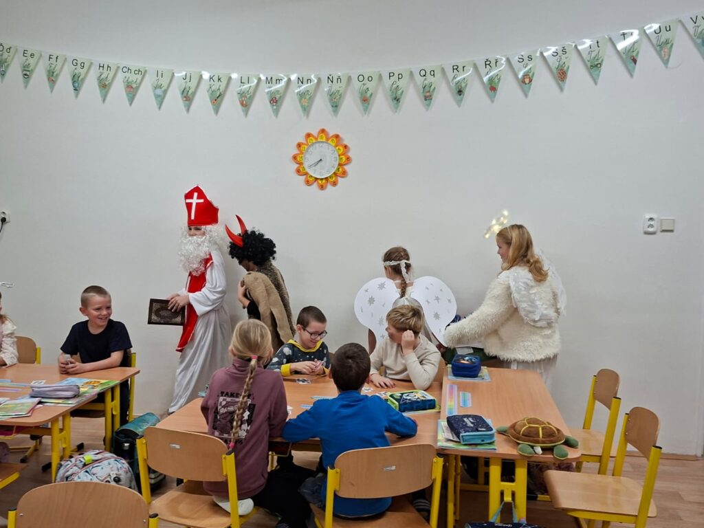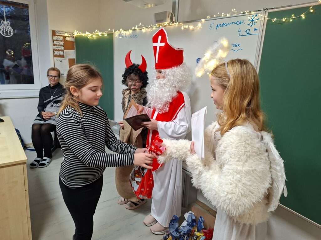 Ani v druhé třídě čert děti nešetřil V pekelné knize četl jejich nešvary, andělé děti obhajovali. Bylo úsměvné a dojemné, že se nikdo nepokusil pravou identitu Mikuláše, čerta a andělů odhalit a nespolupracovat. A tak i naši starší žáci recitovali a zpívali a po zásluze si odnášeli mikulášský balíček.