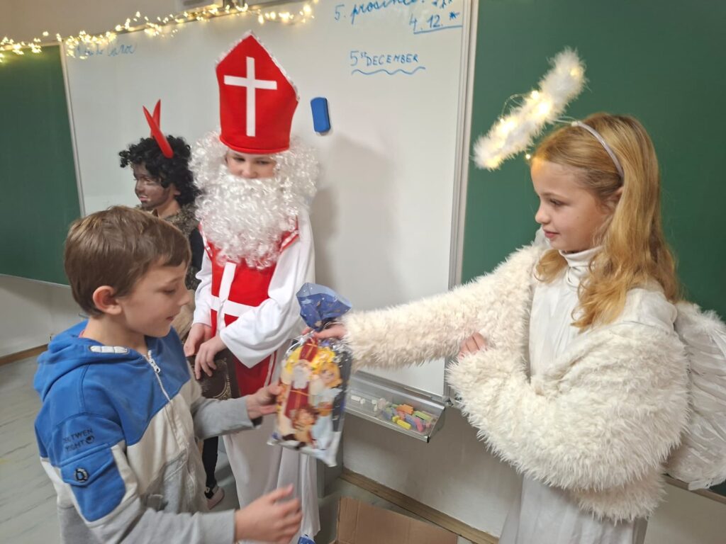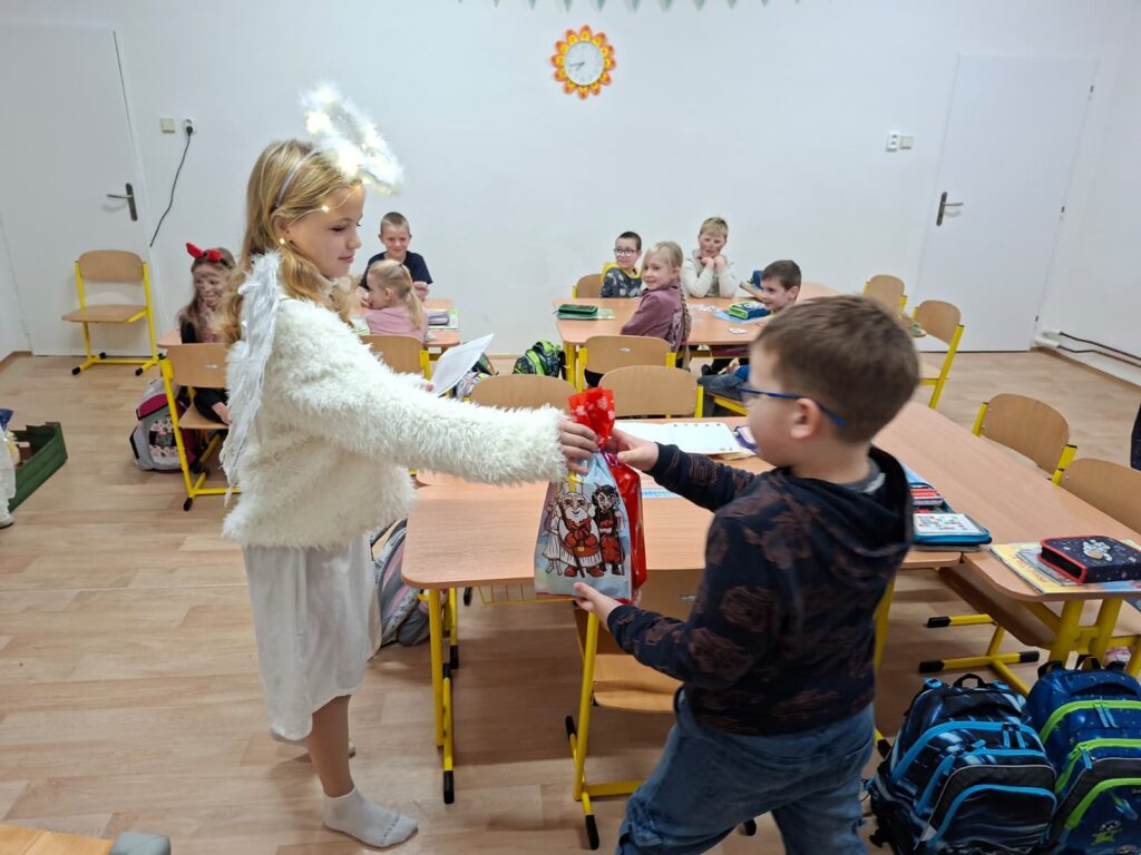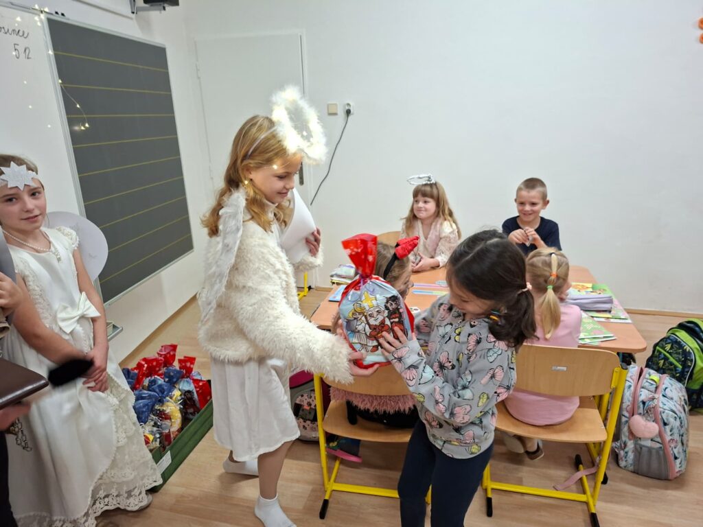 Nejdříve zamířili k mladším žákům. Čert vyjmenovával dětem jejich školní nešvary, andělé se naopak dětí zastávali a vyjmenovávali jejich dobré vlastnosti. Nakonec si každý mikulášský balíček odnesl. Předtím ale musel Mikuláši a jeho „družině“ přednést nějakou básničku nebo zazpívat svou oblíbenou písničku.