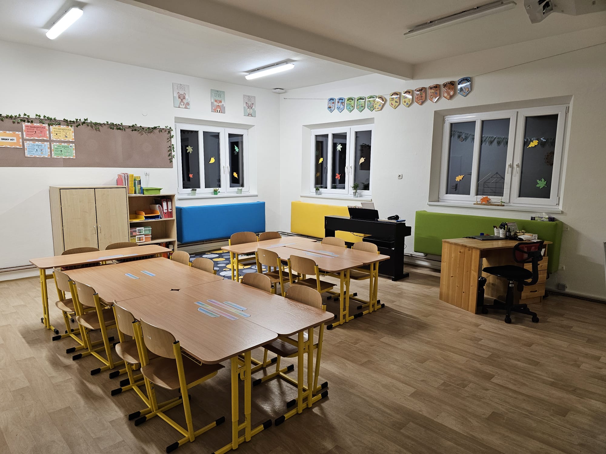 Velkou třídu jsme změnili na školní družinu a postupně zde vybudujeme také učebnu matematiky a anglického jazyka. Zatím nám přišel první set jednodílných lavic a židlí, na konci listopadu bychom měli mít učebnu a zároveň družinu kompletní.
